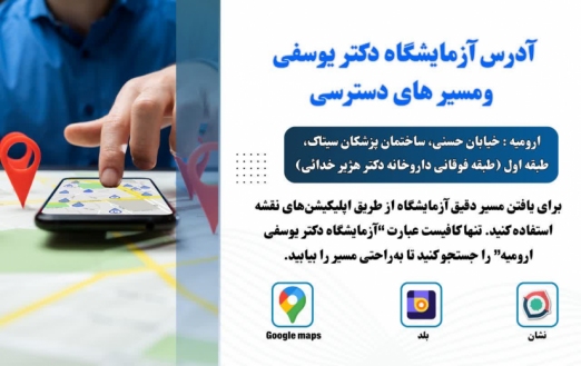 ارومیه، خیابان حسنی (پنجاه متر بالاتر بانک مهر ایران شعبه حسنی)، ساختمان پزشکان سیتاک - طبقه اول، آزمایشگاه دکتر یوسفی