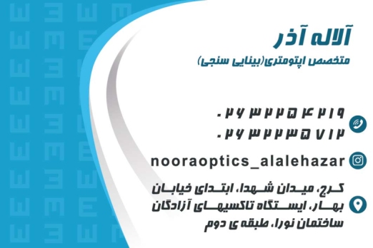 **آلاله آذر** از کارشناسان برجسته حوزه بینایی‌سنجی در کرج است که بیش از **سی سال** به‌صورت تخصصی در زمینه ارزیابی، اصلاح و مراقبت از بینایی فعالیت می‌کند. تجربه طولانی، دقت علمی و به‌کارگیری **به‌روزترین تجهیزات اپتومتری و چشم‌پزشکی** باعث شده خدمات ایشان در میان مراجعان به‌عنوان ترکیبی از مهارت حرفه‌ای و تکنولوژی پیشرفته شناخته شود.