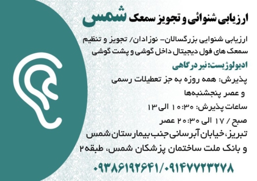 ارزیابی شنوائی و تجویز سمعک شمس مطب در تبريز دارند. برای دیدن اطلاعات کامل مطب، پروفایل ارزیابی شنوائی و تجویز سمعک شمس را ببینید.
