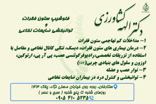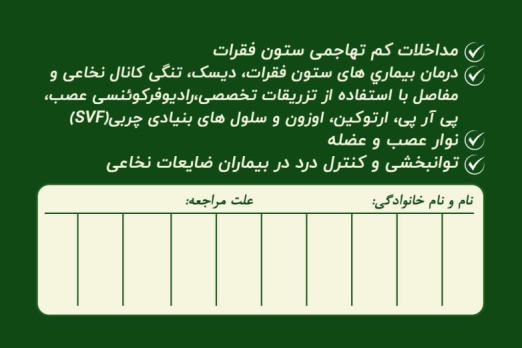 درمان بیمای های ستون فقرات ، دیسک ، تنگی کانال نخاعی و مفاصل با استفاده از تزریقات تخصصی ، رادیوفرکوئنسی عصب ، پی آر پی ، ارتوکین ، اوزون و سلول های بنیادی چربی (svf)