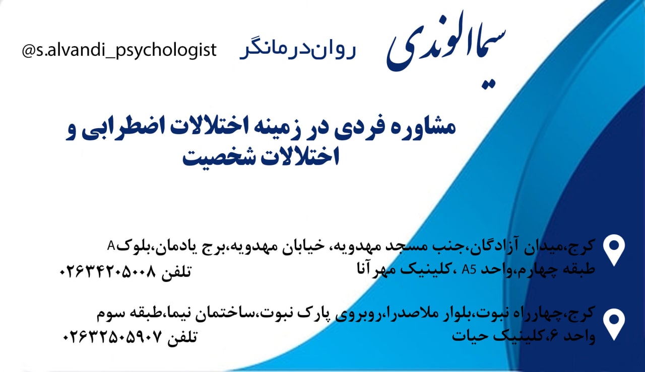روان درمانگر سیما الوندی مطب در کرج دارند. برای دیدن اطلاعات کامل مطب، پروفایل روان درمانگر سیما الوندی را ببینید.