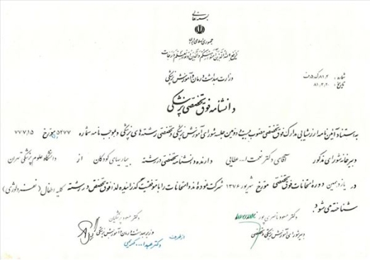 19.تقدیر و تشکر معاون محترم آموزشی وقت بیمارستان مرکز طبی کودکان از ایشان طی نامه شماره 57 – آ مورخ 08/ 08/ 1386به پاس احراز رتبه دوم در رابطه با آموزش بالینی دانشجویان در نظر خواهی محرمانه از آنان.