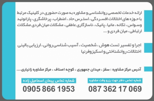 ارائه خدمات تخصصی روانشناسی و مشاوره به صورت حضوری در کلینیک مرتبط با حوزه های اختلالات افسردگی، استرس حاد ، اضطراب، پرخاشگری ، پارانوئید وسواس ، تکانه ، مانیا ، پانیک ، ناسازگاری عاطفی مشکلات میان فردی مشکلات ارتباطی میان فردی و ...